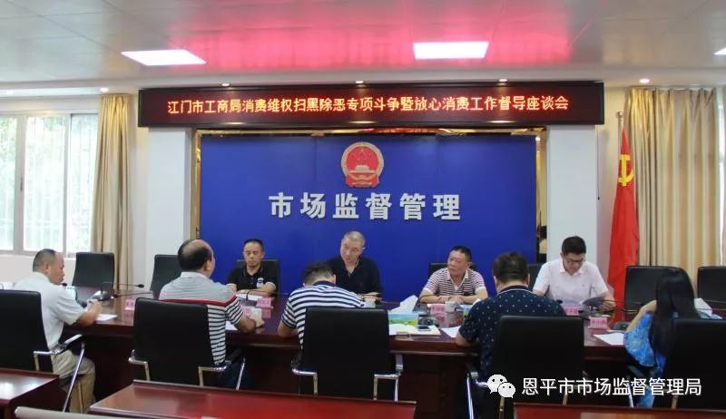 为认真贯彻落实国家、省、市扫黑除恶专项斗争工作部署,履行市场监管部门扫黑除恶职责,8月7日,江门市工商局党组成员、经检支队长胡振雄带领消保科、消委会相关负责同志到我市市场监管局开展调研督导工作。该局局长李立新、副局长梁智颖以及相关业务股室工作人员陪同调研督导。
