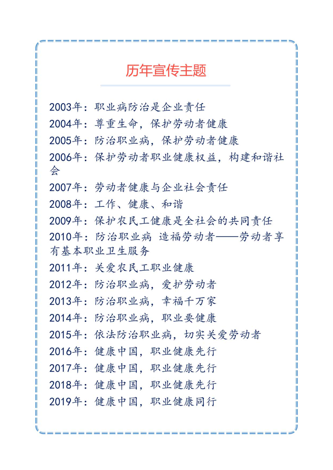 每年4月的最后一周至5月1日国际劳动节(4月25日至5月1日)是全国《职业病防治法》宣传周。2020年是第十八个宣传周,宣传主题是: