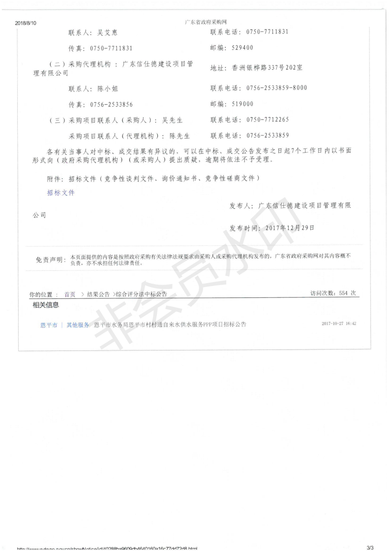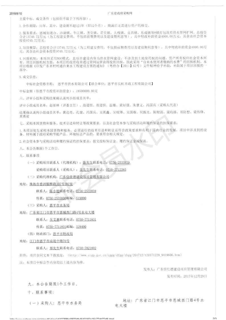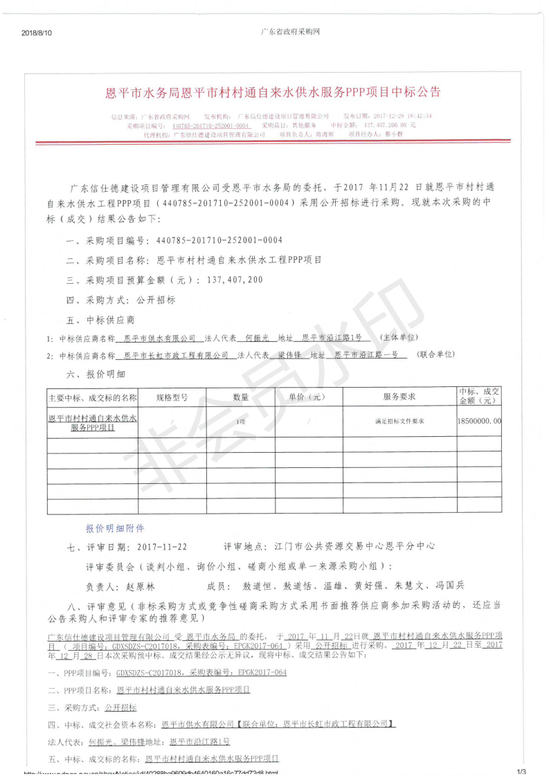 关于全球最大的博彩平台村村通自来水供水服务PPP项目中标的公告