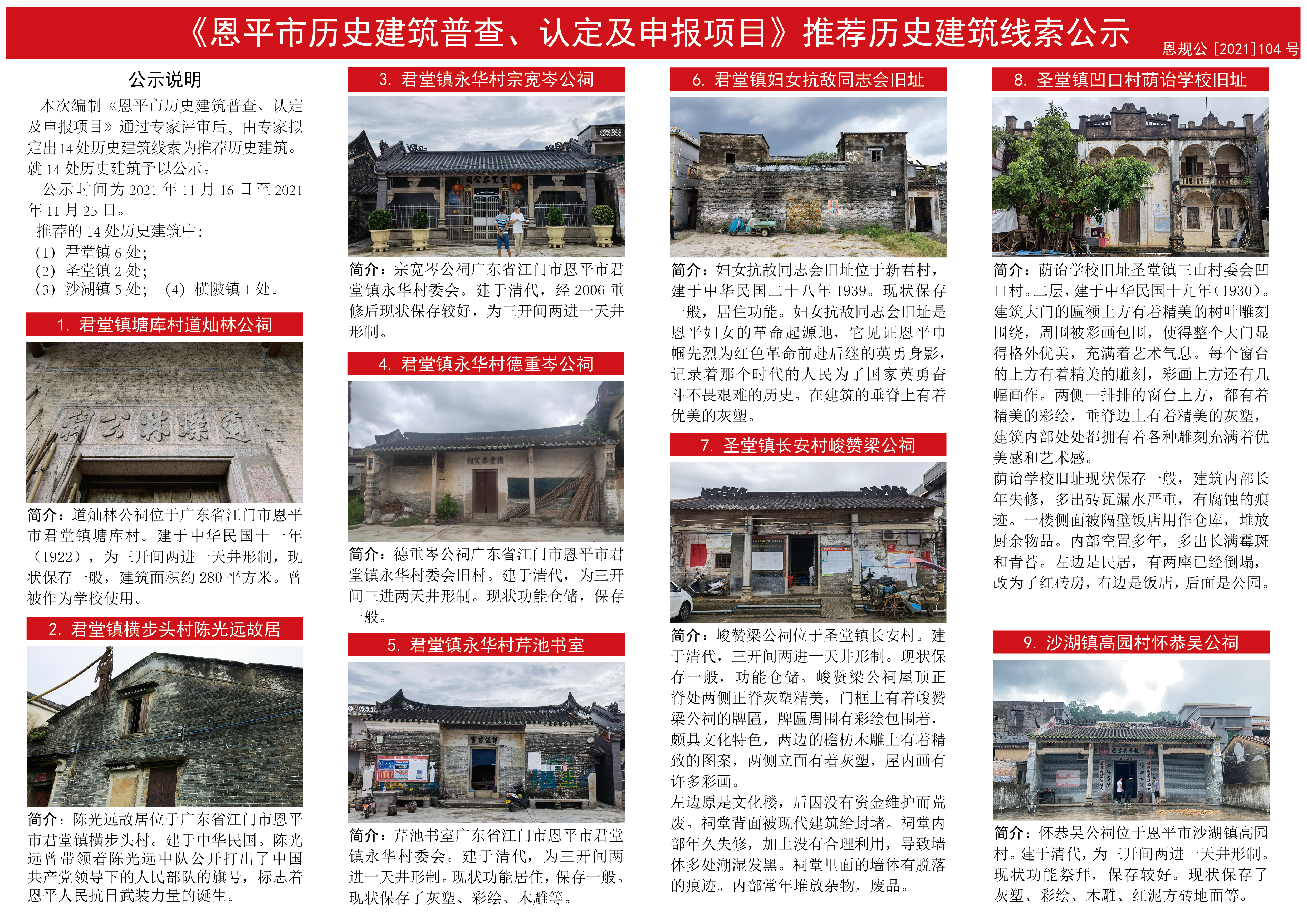 根据《广东省历史建筑测绘建档三年行动计划(2020—2022年)》、《广东省住房和城乡建设厅关于历史文化街区和历史建筑保护工作进展情况的通报》等相关通告及要求,特进行批前公示以征求公众意见。可在公示期限内通过