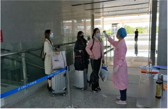 镇人大代表梁春婷在深茂铁路站场为旅客测量体温