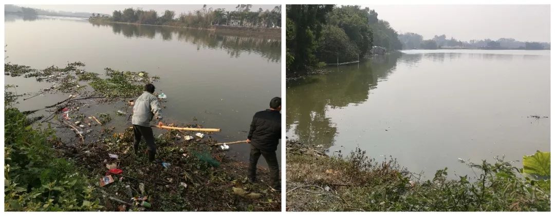 东成镇河长办组织工作人员清理河道水浮莲垃圾前(左图)后(右图)