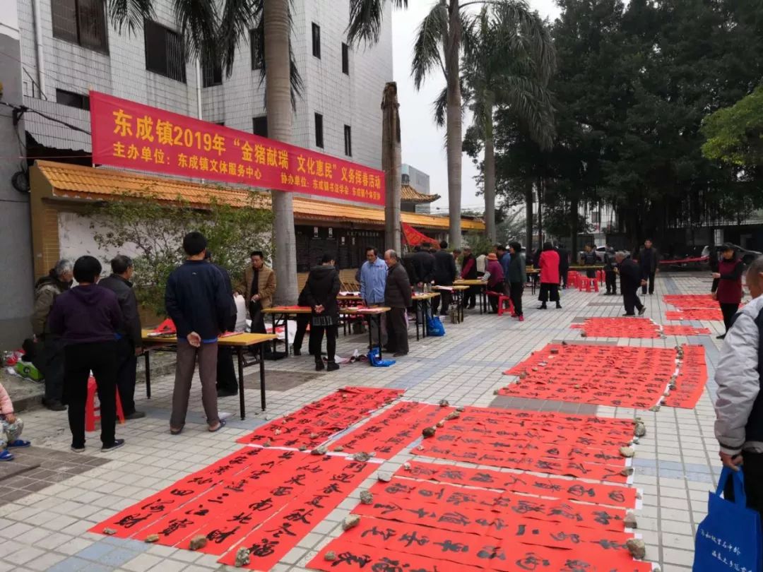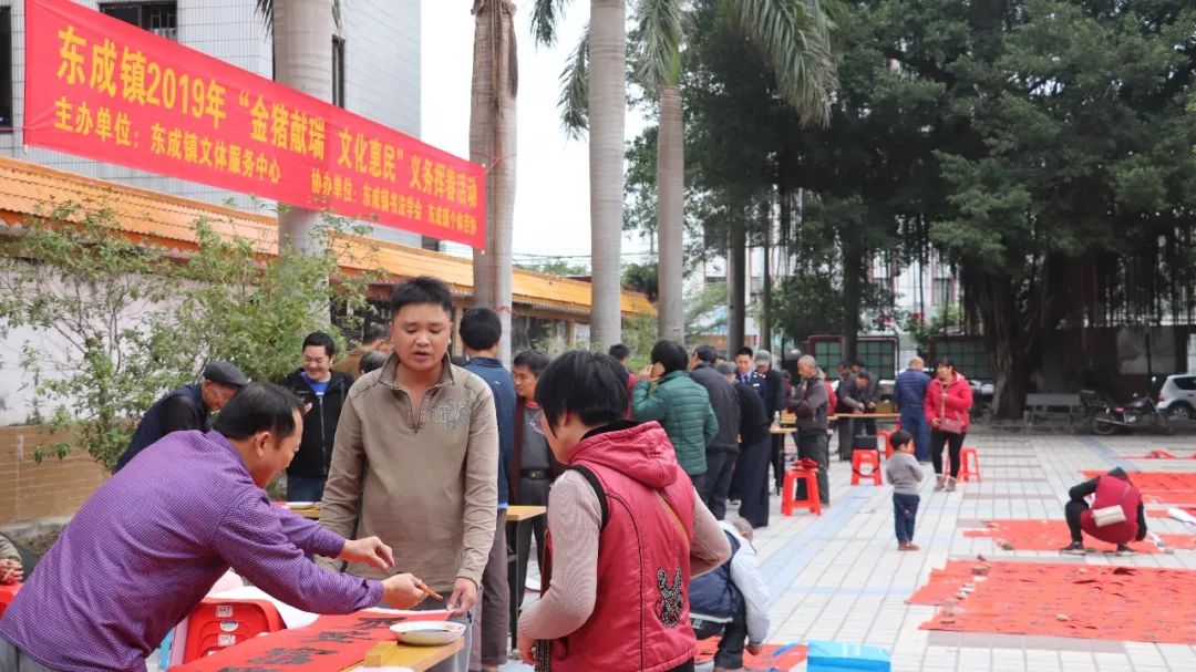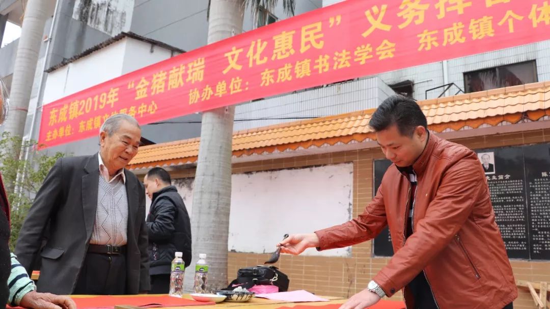 为喜迎新春,1月8日,由东成镇文体服务中心主办,东成镇书法协会和个体劳动者协会协办的2019年“金猪献瑞 文化惠民”义务挥春活动在东成圩镇侨联广场举行。来自市、镇两级书法协会的16名书法家现场挥毫泼墨,向群众义务书写赠送春联近2000幅。