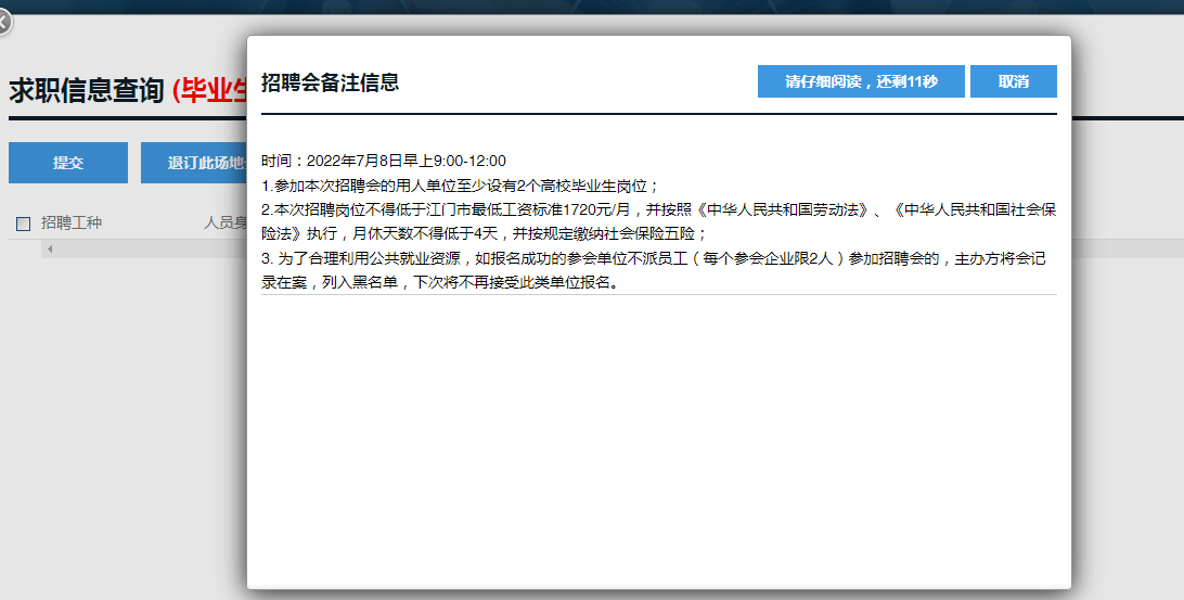 如需参加招聘会,招聘信息审核通过后,可选择“招聘会报名”,点击“查看”查阅招聘会相关信息,点击“我已阅读,并按备注要求进行报名”,选择需要参加招聘会的岗位,点击“提交”。