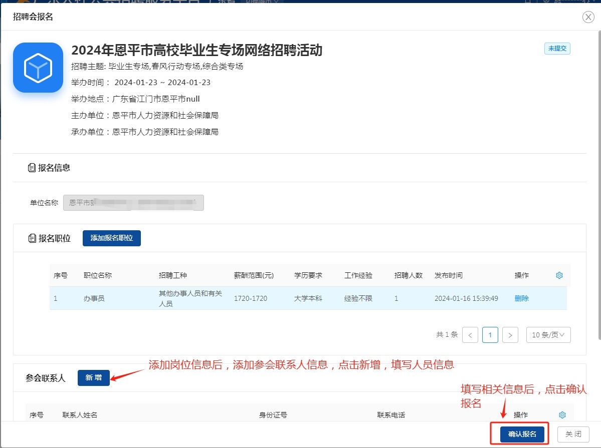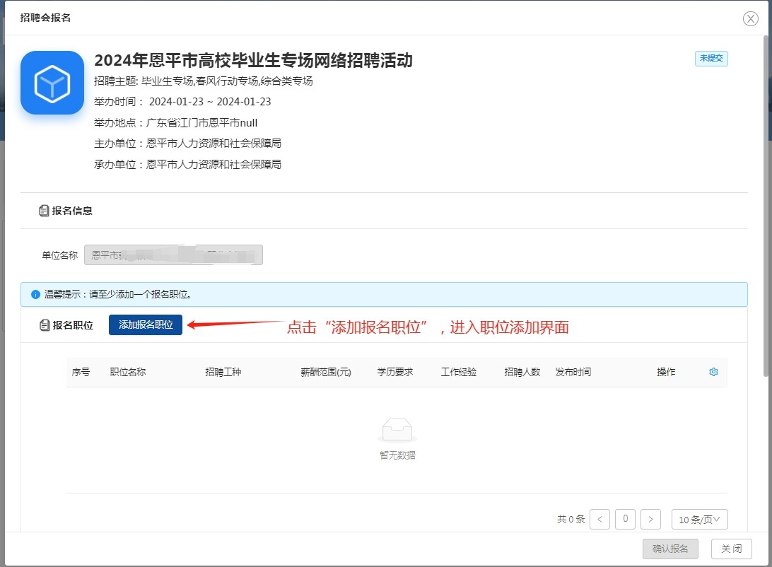 3.招聘会报名:点击“报名参加”,需添加职位信息,添加后确认报名。