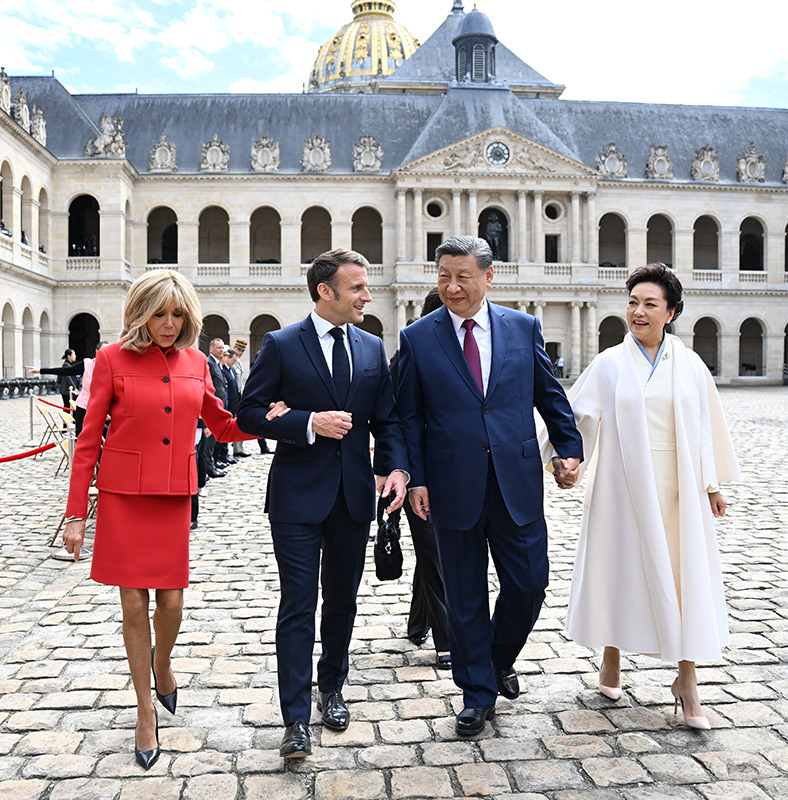 五月的巴黎,风和景明。塞纳河畔,荣军院金色穹顶熠熠生辉,五星红旗和蓝白红三色旗迎风飘扬。