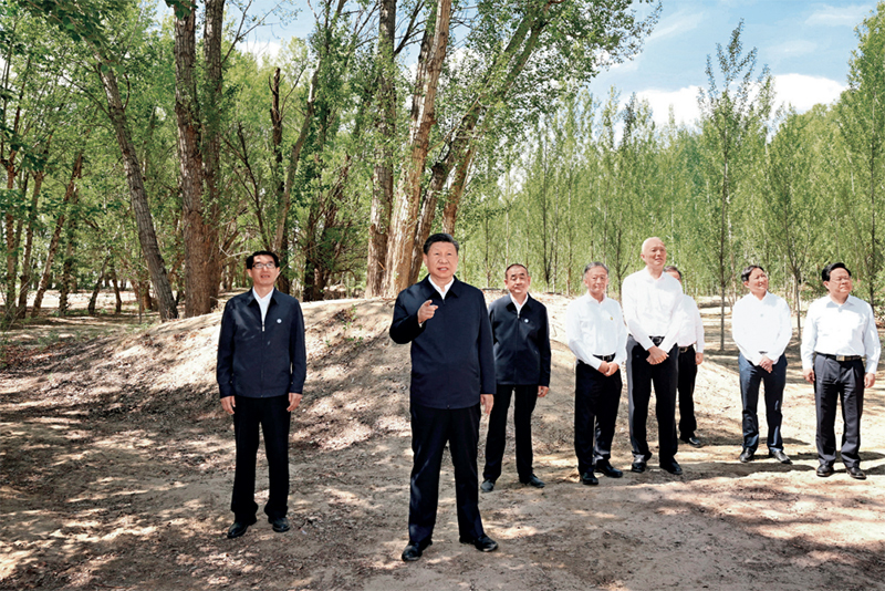 2023年6月5日至6日,中共中央总书记、国家主席、中央军委主席习近平在内蒙古巴彦淖尔考察,并主持召开加强荒漠化综合防治和推进“三北”等重点生态工程建设座谈会。这是6日上午,习近平在临河区国营新华林场考察。新华社记者 谢环驰/摄