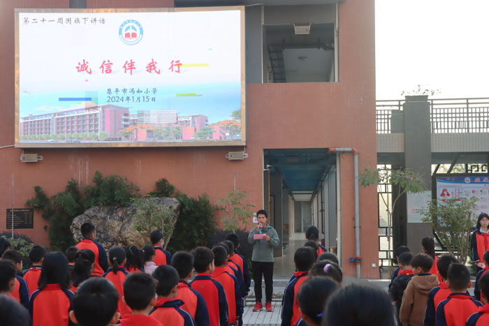 为营造诚信考试的考试氛围,培养学生自立自律、刻苦学习的作风,在星期一的升旗仪式上,冯如小学大队少先队辅导员吴艺聪老师发表了题为《诚信伴我行》的国旗下讲话,引导学生形成正确的价值观,从而端正考风、优化学风,争做文明学生。