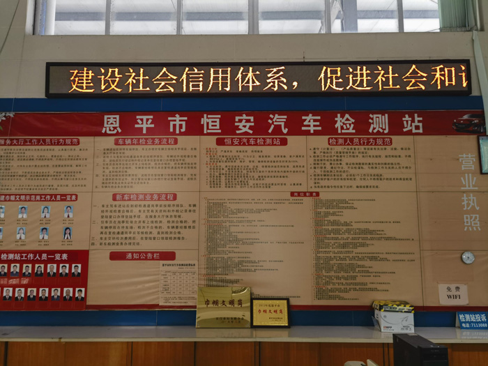 同时,在检测站服务大厅LED屏滚动播放诚信宣传标语,有效提高服务大厅工作人员及办事群众的诚信意识,营造讲诚信、树新风、创文明的经营环境。