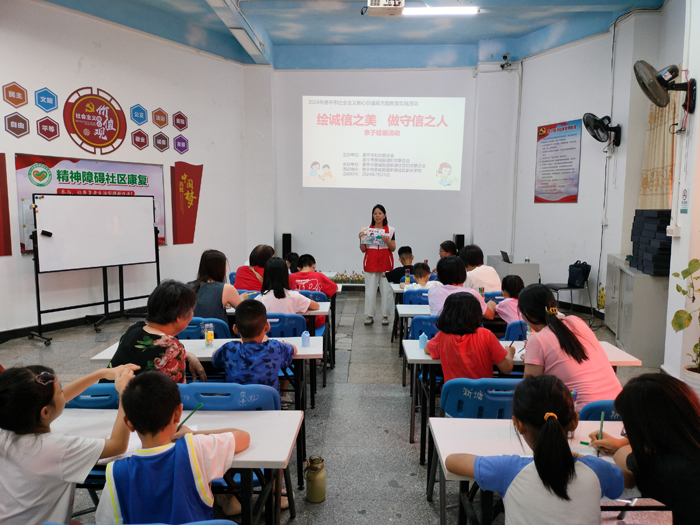 7 月 25 日下午,市妇联又别出心裁地在恩城街道新塘社区家长学校开展了“绘诚信之美 做守信之人”亲子绘画活动。众多亲子家庭积极参与,孩子们在家长的陪伴下,用手中的画笔描绘出他们心中的诚信世界。通过这种亲子互动的方式,不仅增进了家庭成员之间的感情,更让诚信的种子在孩子们心中生根发芽。