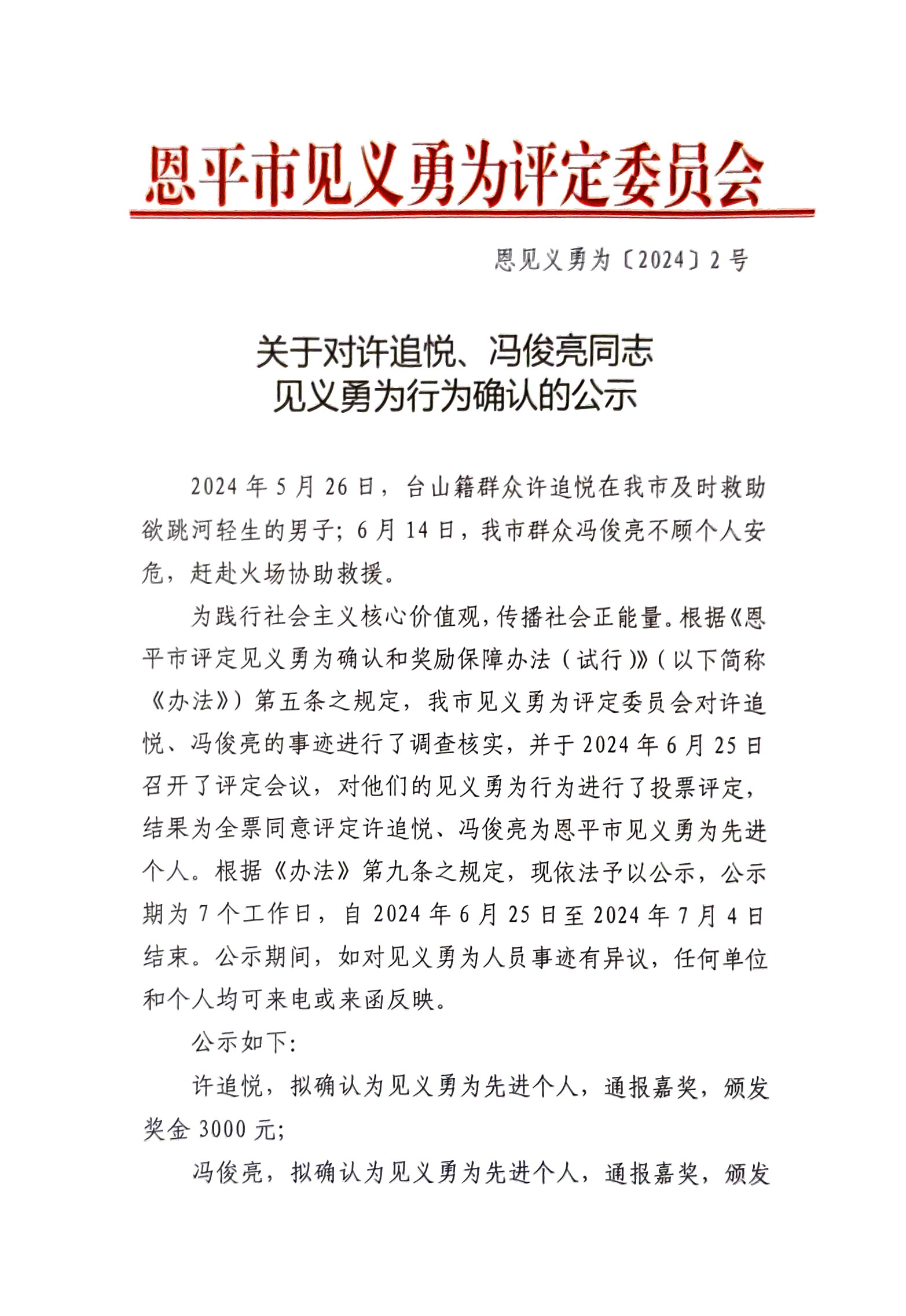 评定见义勇为确认和奖励保障办法(试行)》(以下简称《办法》)第五条之规定,我市见义勇为评定委员会对许追悦、冯俊亮的事迹进行了调查核实,并于2024年6月25日召开了评定会议,对他们的见义勇为行为进行了投票评定,结果为全票同意评定许追悦、冯俊亮为全球最大的博彩平台