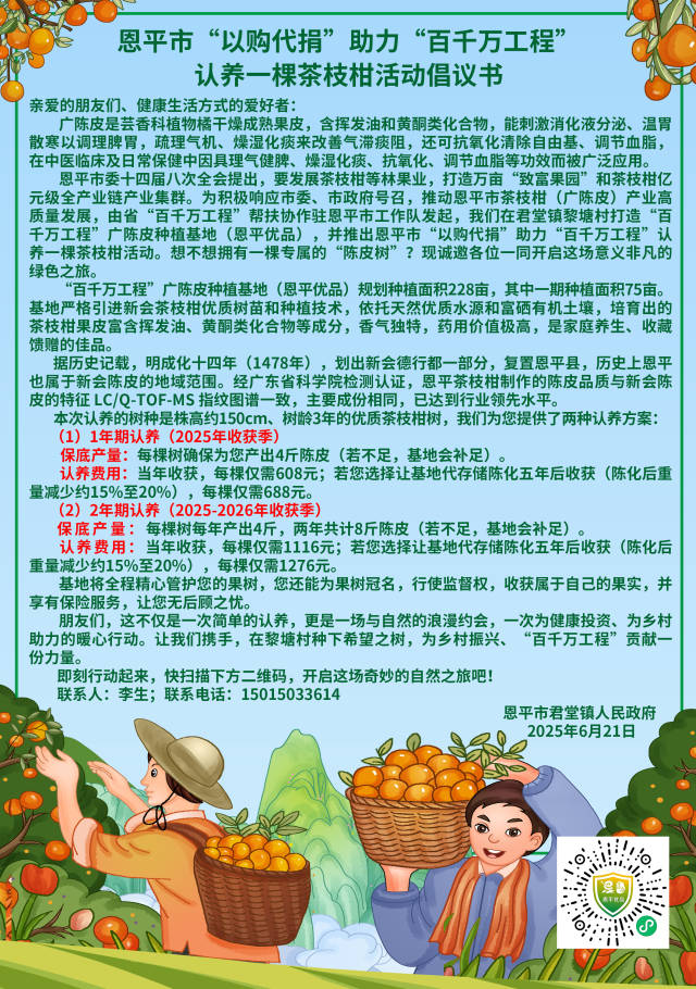 据介绍,每棵果树当年保底陈皮产量4斤。果树实行全过程质控体系管理,保险兜底,实现绿色无公害生产。从认养开始,每棵茶枝柑树都可冠名挂牌,让每一份自然馈赠都“有名有姓”。