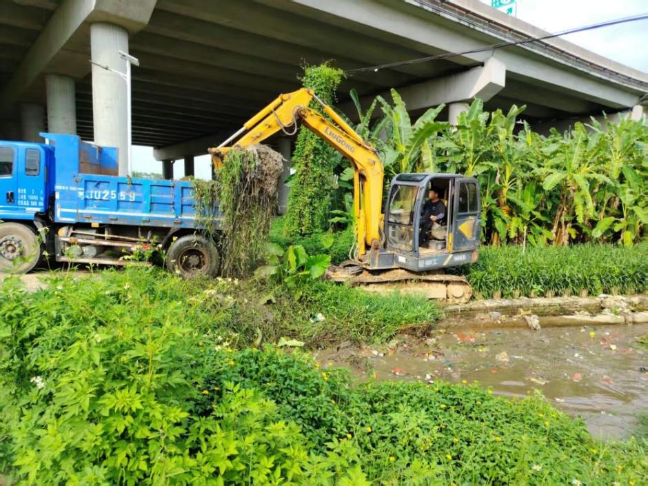 村委会工作人员在台风前开展疏通水渠工作