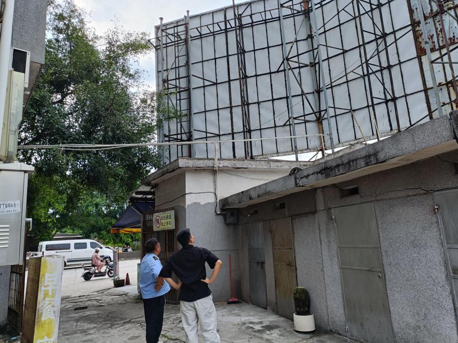 镇城监部门在台风前检查户外广告牌
