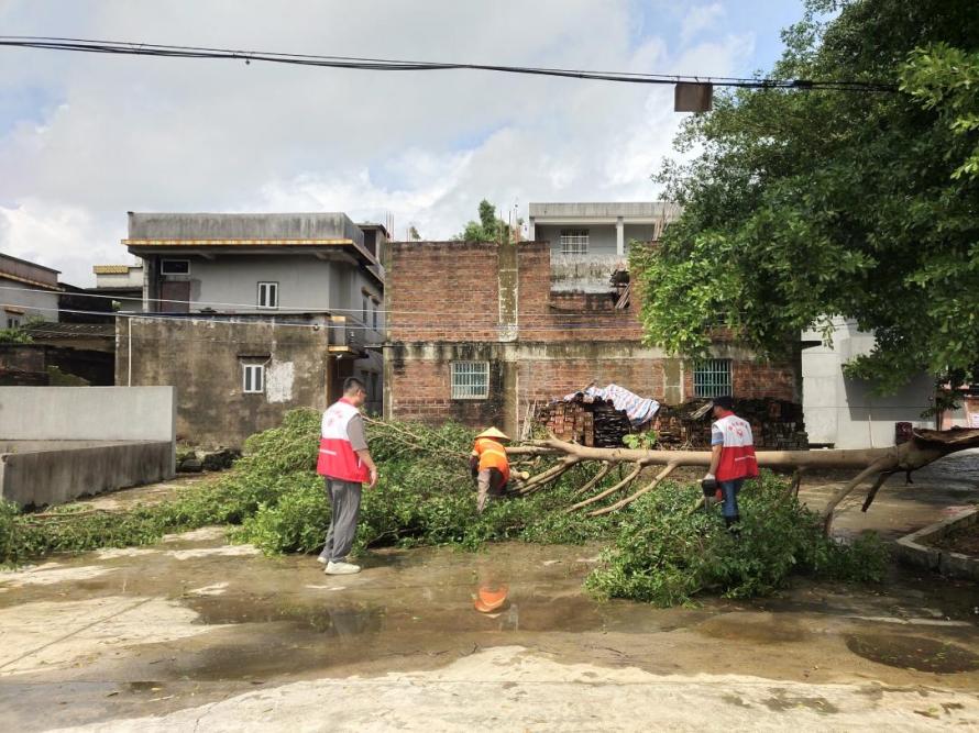 在台风登陆带来的强风骤雨下,君堂镇多条路段出现行道树倒伏、杂物堆积等情况,影响群众出行安全。在中安村委会砂珠岗村,一棵近十米高的大树被狂风刮倒,枝干压倒电线杆,导致附近多条自然村停电。接到群众反映后,由镇应急办、供电部门等组成的抢险小组第一时间赶到现场。