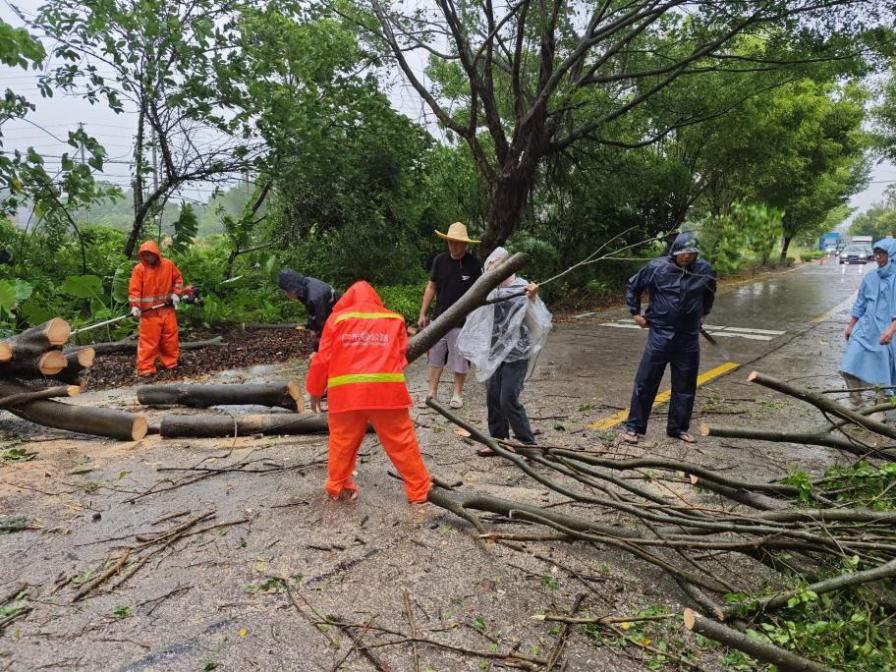 应急队员冒雨清理主干道倒伏树木