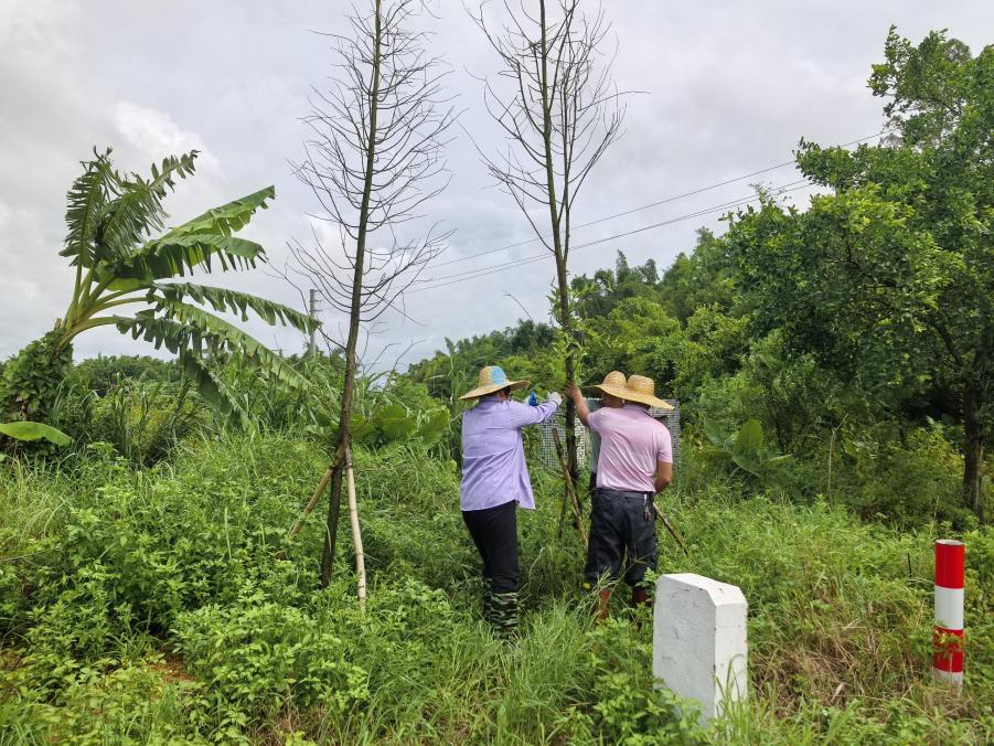 台风过后,村委会工作人员对路边树木进行扶正加固工作