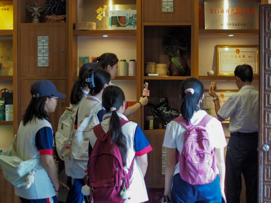 实践团参观了簕菜文化创意园的文化展示区,并深入簕菜深加工厂区,通过全链条透明化生产线,完整观摩了从原料筛选到簕菜茶等精制产品的转化过程,与车间负责人就标准化生产工艺、设备智能化应用等关键技术展开交流。