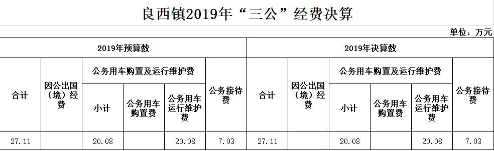 良西镇人民政府2019年度“三公”经费财政拨款支出决算为27.11万元,完成预算27.11万元的100.00%。其中:因公出国(境)费支出决算为0万元,完成预算0万元的0%;公务用车购置及运行维护费支出决算为20.08万元,完成预算20.08万元的100.00%;公务接待费支出决算为7.03万元,完成预算7.03万元的100%。2019年度“三公”经费支出决算等于预算数的主要原因是认真贯彻落实中央八项规定精神和厉行节约的要求,从严控制“三公”经费开支,全年实际支出严格按照预算执行。