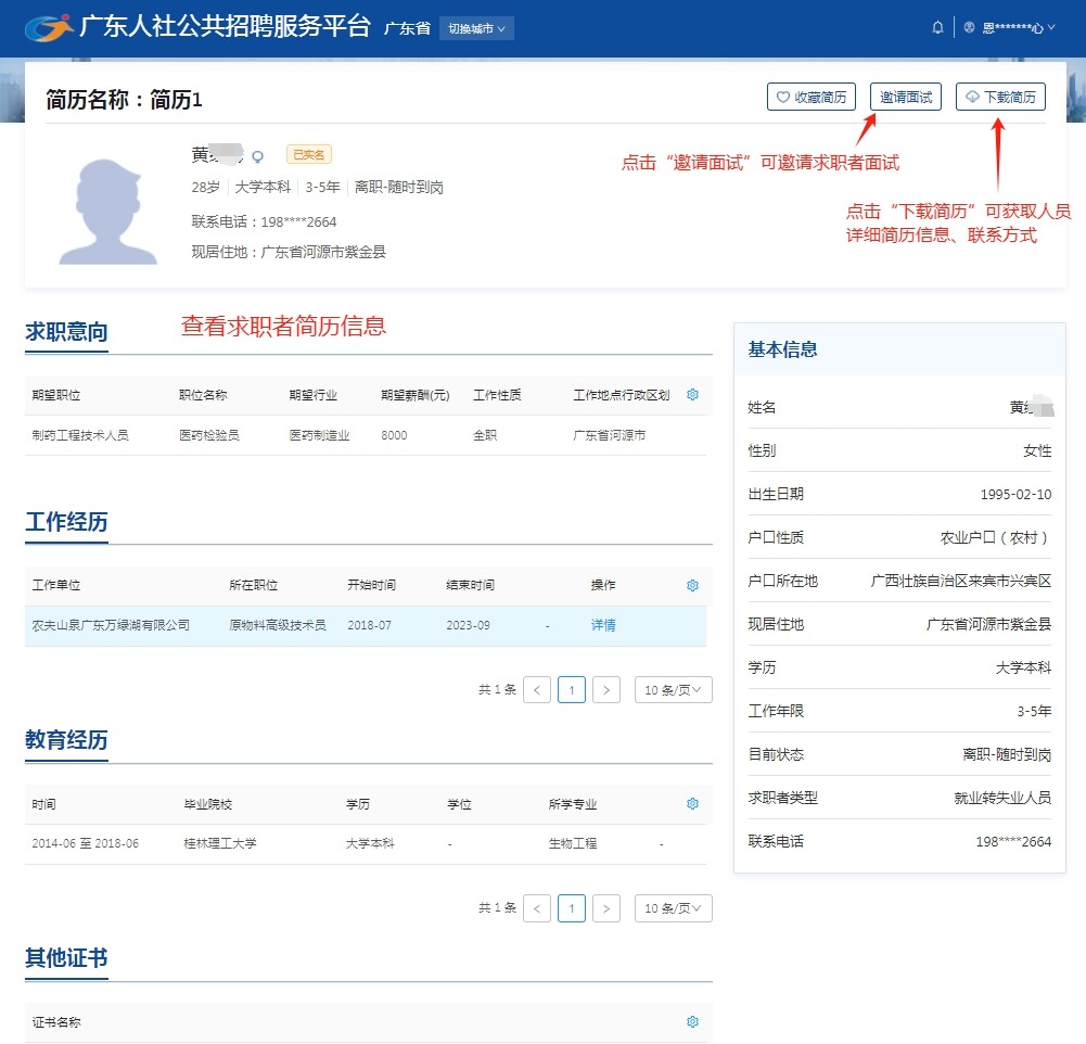 2.求职者简历信息中,显示的联系方式隐藏,可通过“下载简历”,获取求职者详细简历信息、联系方式。