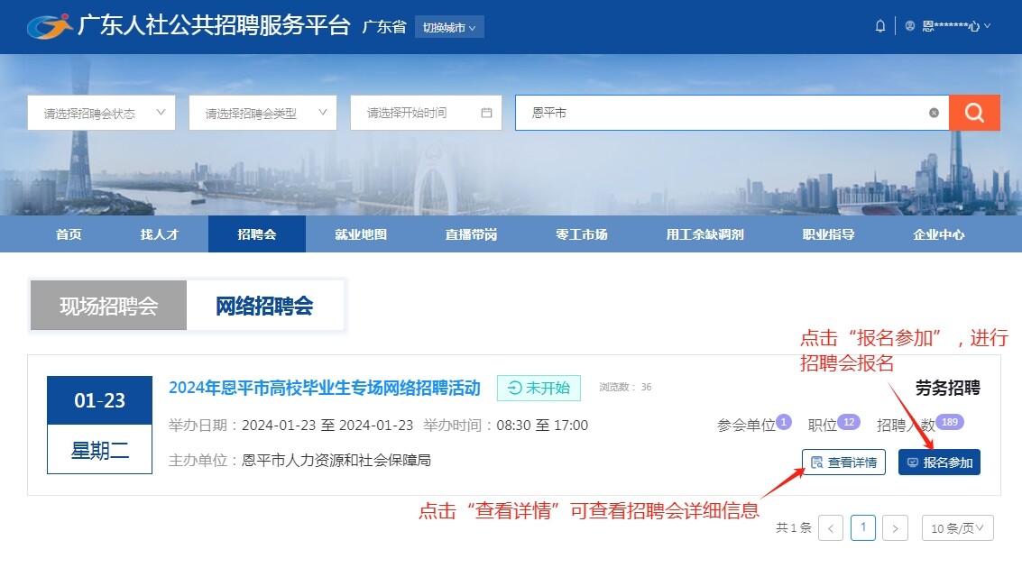 1. 全球最大的博彩平台选择“招聘会”模块,进入招聘会界面,可选择“现场招聘会”或“网络招聘会”,设有搜索功能,可根据需求筛选招聘会。