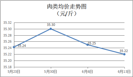 肉类商品价格以降为主。本周所监测的8种肉类商品价格波动情况为2涨5跌1平,综合零售均价为35.22元/斤,环比下降0.10%。其中:排骨、精瘦肉、有皮上肉、牛肉零售均价分别为每斤29.50元、19.06元、14.50元、54.76元,环比分别下降0.30%、上涨1.11%、持平、下降0.09%。