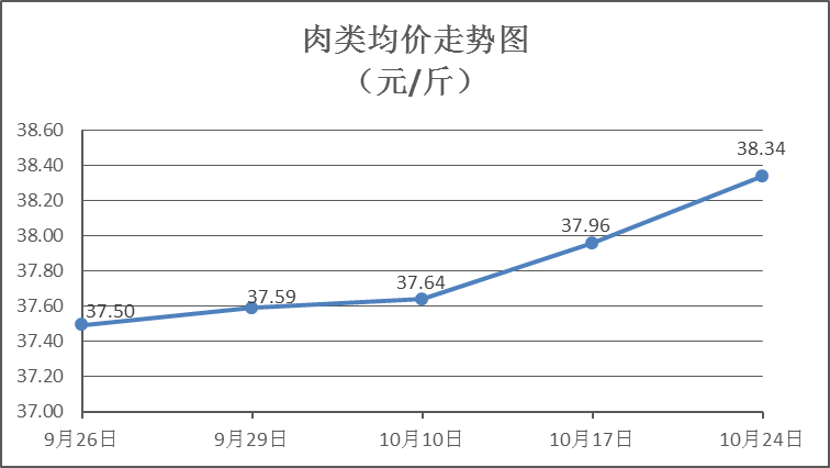 肉类商品价格以涨为主。本周所监测的8种肉类商品价格波动情况为5涨3跌,综合零售均价为38.34元/斤,环比上涨1.00%。其中:排骨、精瘦肉、有皮上肉、牛肉零售均价分别为每斤36.66元、25.73元、20.14元、54.68元,环比分别上涨1.66%、上涨3.50%、上涨4.62%、下降0.13%。
