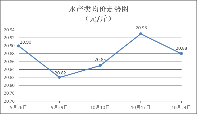 水产类商品价格窄幅盘降。本周所监测的10种水产商品价格波动情况为4涨3跌3平,综合均价为20.88元/斤,环比下降0.27%。其中:草鱼、鲫鱼、罗非鱼、基围虾零售均价分别为每斤11.54元、14.07元、8.73元、37.96元,环比分别下降0.35%、上涨1.44%、上涨0.23%、下降1.86%。