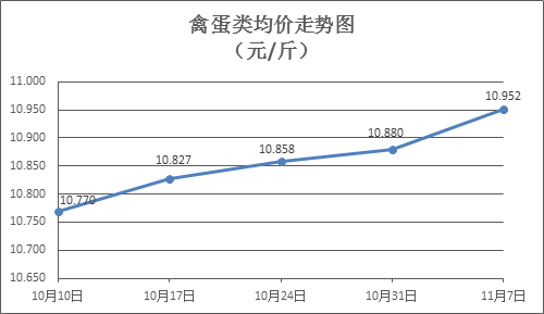 禽蛋类商品价格有所上涨。本周所监测的6种禽蛋类商品价格波动情况为4涨1跌1平,综合零售均价为10.952元/斤,环比上涨0.66%。其中:白条鸡、白条鸭零售均价分别为每斤20.47元、15.29元,环比分别上涨0.64%、上涨0.92%;红壳鸡蛋、鸭蛋零售均价分别为每斤6.87元、7.67元,环比分别上涨0.15%、上涨2.54%。
