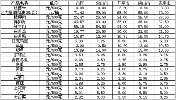 说明:1、表中价格为该地区监测点综合平均价;2、“市区”含蓬江区、江海区、新会区,价格分别采自蓬江市场、江南市场、城东市场等13家农贸市场;3、其他四个县市价格分别采自新鹤市场、锦江市场等8家农贸市场。