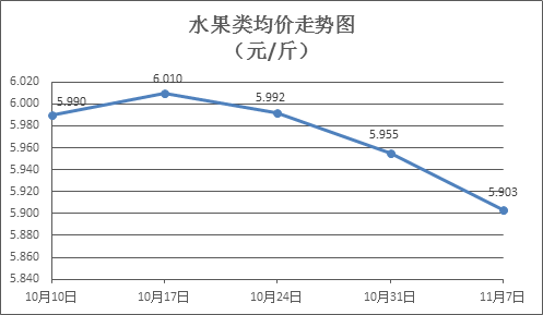 水果类商品价格有所下降。本周所监测的6种水果商品价格波动情况为1涨5跌,综合零售均价为5.903元/斤,环比下降0.87%。其中橙子、葡萄、梨零售均价分别为每斤6.40元、11.36元、4.90元,环比分别下降1.23%、下降0.26%、下降4.11%。