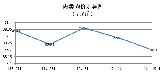 肉类商品价格总体微降。本周所监测的8种肉类商品价格波动情况为2涨6跌,综合零售均价为38.20元/斤,环比下降0.24%。其中:排骨、精瘦肉、有皮上肉、牛肉零售均价分别为每斤35.22元、24.54元、20.43元、54.99元,环比分别下降1.45%、下降0.85%、下降1.87%、上涨0.13%。