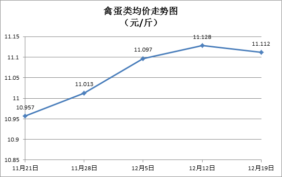 禽蛋类商品价格窄幅盘整。本周所监测的6种禽蛋类商品价格波动情况为3涨3跌,综合零售均价为11.112元/斤,环比下降0.15%。其中:白条鸡、白条鸭零售均价分别为每斤20.41元、15.59元,环比分别下降0.49%、上涨0.19%;白壳鸡蛋、鸭蛋零售均价分别为每斤7.25元、7.79元,环比分别下降0.55%、上涨0.26%。