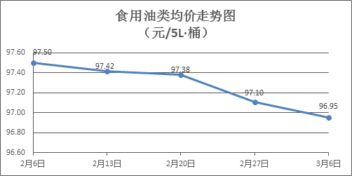 食用油类商品价格总体微降。本周所监测的9种食用油(5L装)商品价格波动情况为1涨5跌3平,综合零售均价为96.95元/桶,环比下降0.16%。其中:鲁花花生油、金龙鱼调和油零售均价分别为每桶157.51元、71.46元,环比分别下降0.67%、持平。