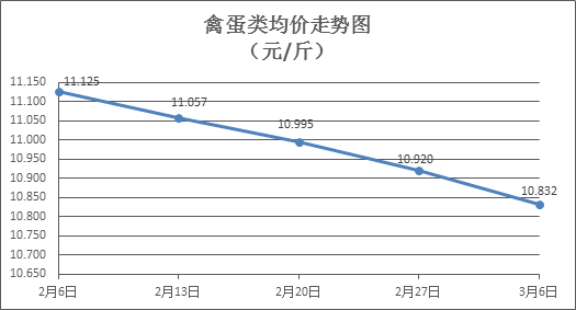 禽蛋类商品价格略有下降。本周所监测的6种禽蛋类商品价格波动情况为1涨4跌1平,综合零售均价为10.832元/斤,环比下降0.81%。其中:白条鸡、白条鸭零售均价分别为每斤19.68元、15.01元,环比分别下降1.06%、下降1.83%;白壳鸡蛋、鸭蛋零售均价分别为每斤7.01元、7.72元,环比分别下降0.28%、下降0.77%。