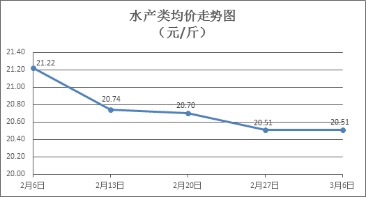 水产类商品价格小幅盘整。本周所监测的10种水产商品价格波动情况为3涨3跌4平,综合均价为20.51元/斤,环比下降0.01%。其中:草鱼、鲫鱼、罗非鱼、基围虾零售均价分别为每斤11.11元、14.03元、8.64元、38.74元,环比分别下降0.63%、下降0.14%、上涨0.70%、上涨0.28%。