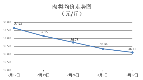 肉类商品价格继续下跌。本周所监测的8种肉类商品价格7跌1平,综合零售均价为36.12元/斤,环比下降0.61%。其中:排骨、精瘦肉、有皮上肉、牛肉零售均价分别为每斤31.65元、20.98元、16.40元、54.21元,环比分别下降1.19%、下降1.69%、下降3.02%、持平。