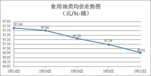 食用油类商品价格总体略降。本周所监测的9种食用油(5L装)商品价格波动情况为1涨5跌3平,综合零售均价为96.91元/桶,环比下降0.18%。其中:鲁花花生油、金龙鱼调和油零售均价分别为每桶157.51元、71.46元,环比分别下降0.63%、持平。