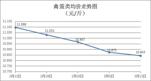 禽蛋类商品价格总体微降。本周所监测的6种禽蛋类商品价格波动情况为2涨4跌,综合零售均价为10.843元/斤,环比下降0.29%。其中:白条鸡、白条鸭零售均价分别为每斤19.65元、15.03元,环比分别下降0.66%、下降0.79%;白壳鸡蛋、鸭蛋零售均价分别为每斤7.02元、7.74元,环比分别下降0.14%、下降0.13%。