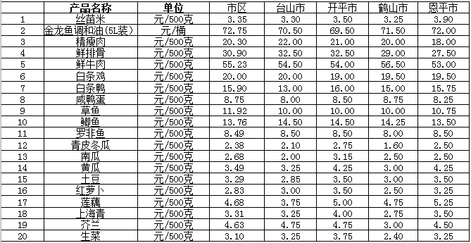 说明:1、表中价格为该地区监测点综合平均价;2、“市区”含蓬江区、江海区、新会区,价格分别采自蓬江市场、江南市场、城东市场等13家农贸市场;3、其他四个县市价格分别采自新华市场、锦江市场等8家农贸市场。