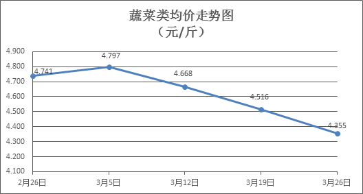 据本市21家农贸市场监测数据显示,上周3月20日至3月26日(下同)市场上各类“菜篮子”商品供应充足,所监测的7大类“菜篮子”商品价格3涨4跌。其中:粮油类商品价格微幅波动,肉菜类、水产类商品价格有所下降,禽蛋类、水果类商品价格总体微升。从近期雨水天气及市场供求情况分析,近期肉类、蔬菜类商品价格有止跌回稳预期,其他商品价格则仍以窄幅盘整为主。