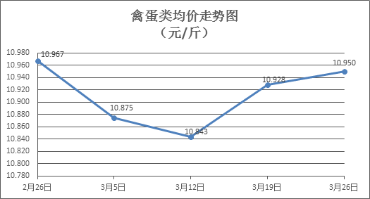 禽蛋类商品价格总体略升。本周所监测的6种禽蛋类商品价格波动情况为4涨2跌,综合零售均价为10.950元/斤,环比上涨0.20%。其中:白条鸡、白条鸭零售均价分别为每斤19.74元、15.37元,环比分别上涨0.10%、上涨0.65%;白壳鸡蛋、鸭蛋零售均价分别为每斤6.91元、7.85元,环比分别下降0.29%、上涨0.13%。