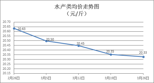 水产类商品价格总体略降。本周所监测的10种水产商品价格波动情况为3涨6跌1平,综合均价为20.33元/斤,环比下降0.12%。其中:草鱼、鲫鱼、罗非鱼、基围虾零售均价分别为每斤10.88元、13.84元、8.39元、38.29元,环比分别上涨0.28%、下降0.79%、下降0.94%、上涨0.05%。