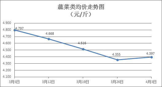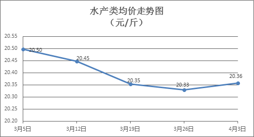 蔬菜类商品价格略有回升。本周所监测的32 种蔬菜商品价格波动情况为20涨11跌1平,综合零售均价为4.397元/斤,环比上涨0.96%。其中:涨幅居前的品种包括花菜、菠菜、本地菜心,零售均价分别为每斤4.36元、4.70元、4.29元,环比分别上涨9.27%、6.33%、5.41%;跌幅居前的品种包括茄子、青尖椒、水空心菜,零售均价分别为每斤4.43元、5.17元、4.87元,环比分别下降5.74%、3.72%、3.56%。