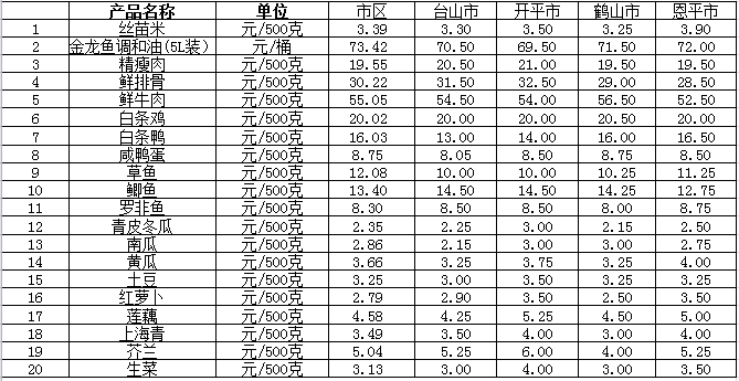 说明:1、表中价格为该地区监测点综合平均价;2、“市区”含蓬江区、江海区、新会区,价格分别采自蓬江市场、江南市场、城东市场等13家农贸市场;3、其他四个县市价格分别采自新华市场、锦江市场等8家农贸市场。