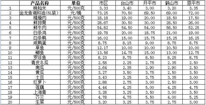 说明:1、表中价格为该地区监测点综合平均价;2、“市区”含蓬江区、江海区、新会区,价格分别采自蓬江市场、江南市场、城东市场等13家农贸市场;3、其他四个县市价格分别采自新华市场、锦江市场等8家农贸市场。