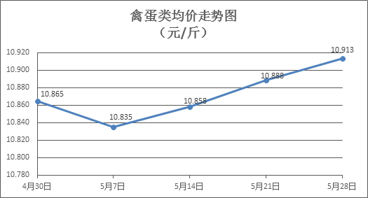 禽蛋类商品价格总体略涨。上周所监测的6种禽蛋类商品价格波动情况为4涨2跌,综合零售均价为10.913元/斤,环比上涨0.23%。其中:白条鸡、白条鸭零售均价分别为每斤19.69元、15.73元,环比分别下降0.40%、上涨1.35%;白壳鸡蛋、鸭蛋零售均价分别为每斤6.66元、7.90元,环比分别下降0.75%、持平。