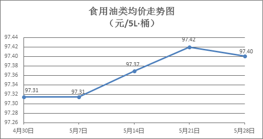食用油类商品价格微幅波动。上周所监测的9种食用油(5L装)商品价格波动情况为2涨4跌3平,综合零售均价为97.40元/桶,环比下降0.02%。其中:鲁花花生油、金龙鱼调和油零售均价分别为每桶157.34元、71.54元,环比分别下降0.06%、持平。