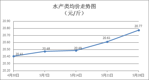 水产类商品价格略有上涨。上周所监测的10种水产商品价格波动情况为8涨1跌1平,综合均价为20.77元/斤,环比上涨0. 78%。其中:草鱼、鲫鱼、鳙鱼、罗非鱼、海虾零售均价分别为每斤11.07元、13.75元、9.98元、8.47元、52.00元,环比分别上涨0.09%、上涨0.73%、下降0.30%、上涨1.19%、上涨2.10%。