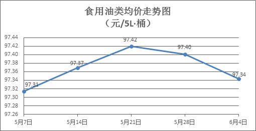 食用油类商品价格略有下降。上周所监测的9种食用油(5L装)商品价格波动情况为7跌2平,综合零售均价为97.34元/桶,环比下降0.06%。其中:鲁花花生油、玉米油零售均价分别为每桶157.28元、76.07元,环比分别下降0.04%、下降0.18%。
